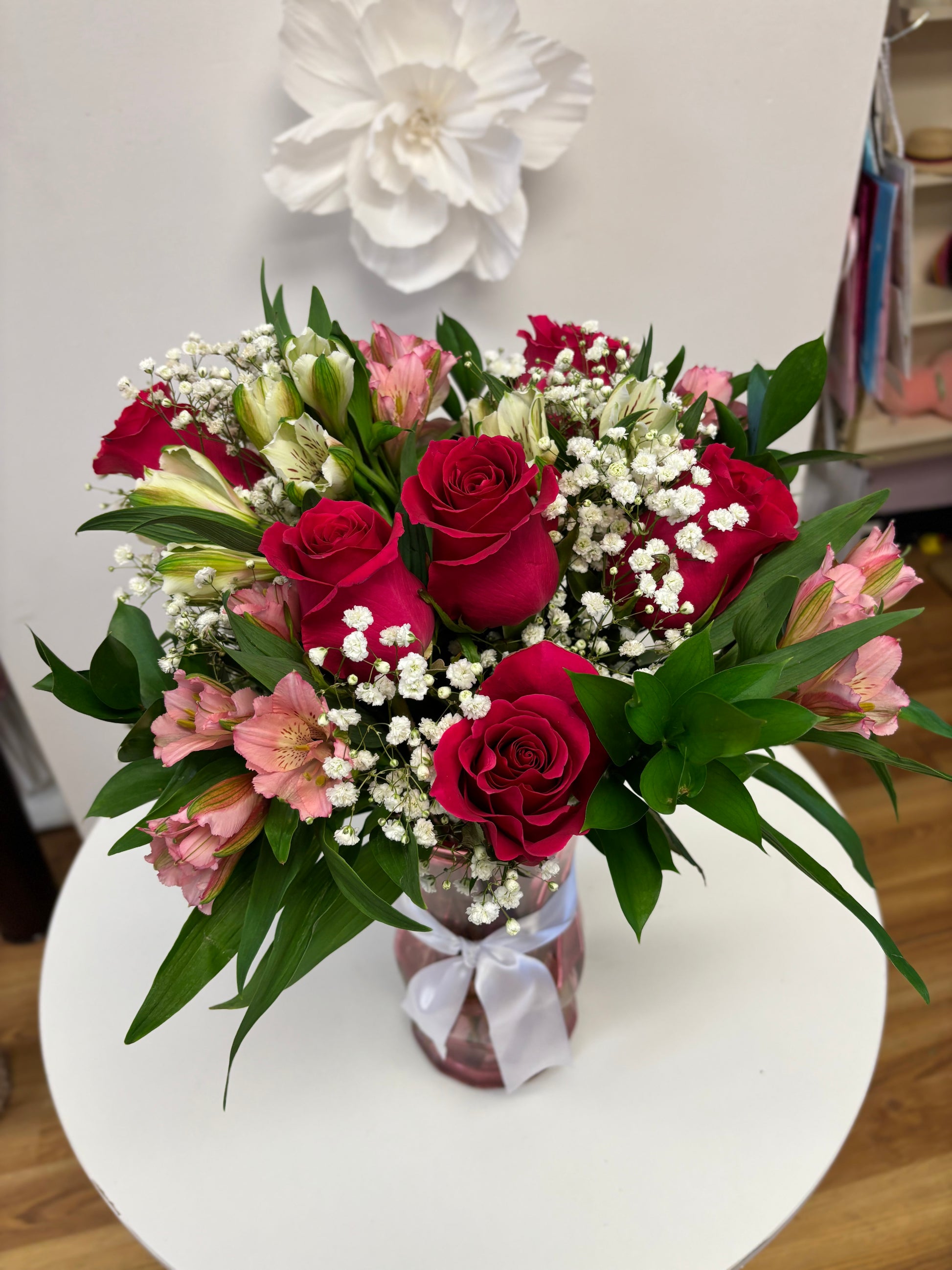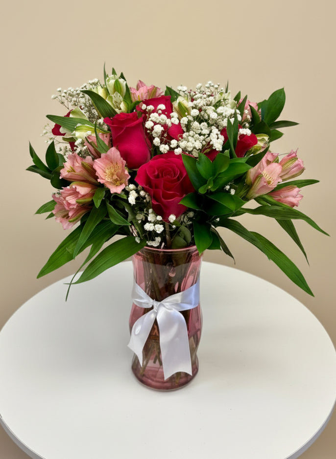 Half a dozen long stemmed roses with pink & white alstroemerias, baby's breath, and greenery. In a tall vase, finished off with a bow.
