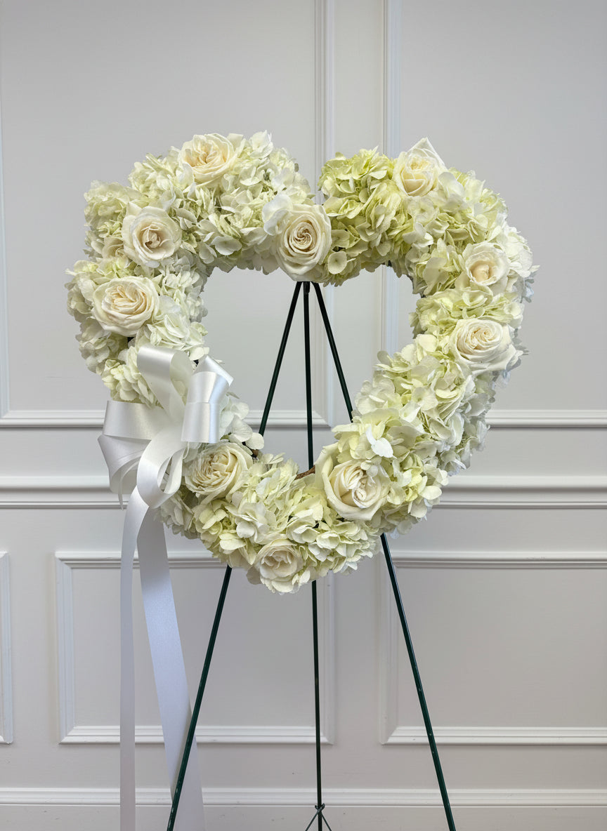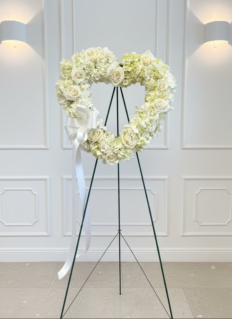 A serene symbol of love and remembrance. This elegant white heart spray is designed to express comfort, purity, and everlasting peace. Crafted with lush white blooms, it offers a graceful tribute to a life beautifully lived and deeply loved.