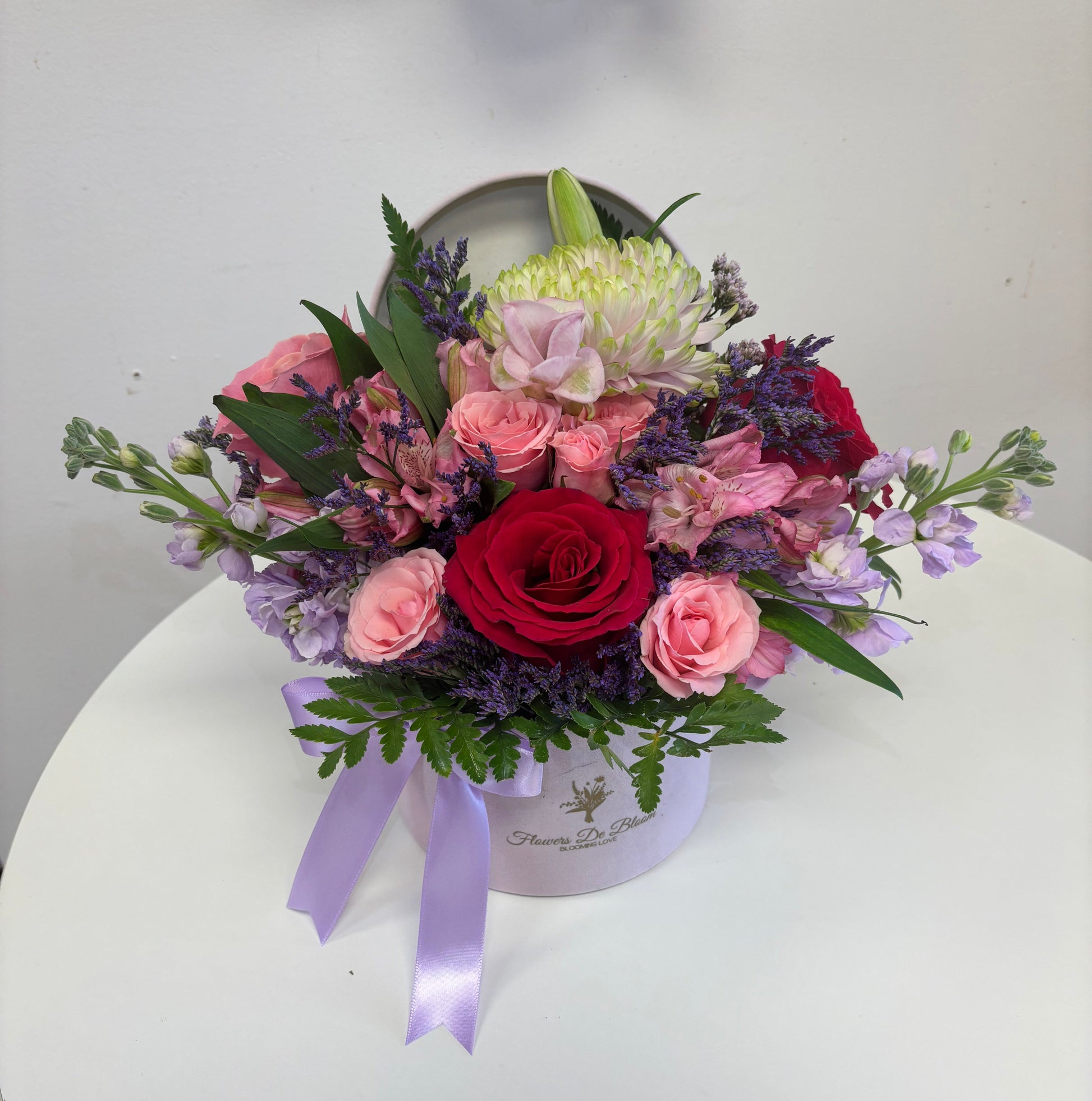 A colorful arrangement of blooms arranged in a velvet lined box