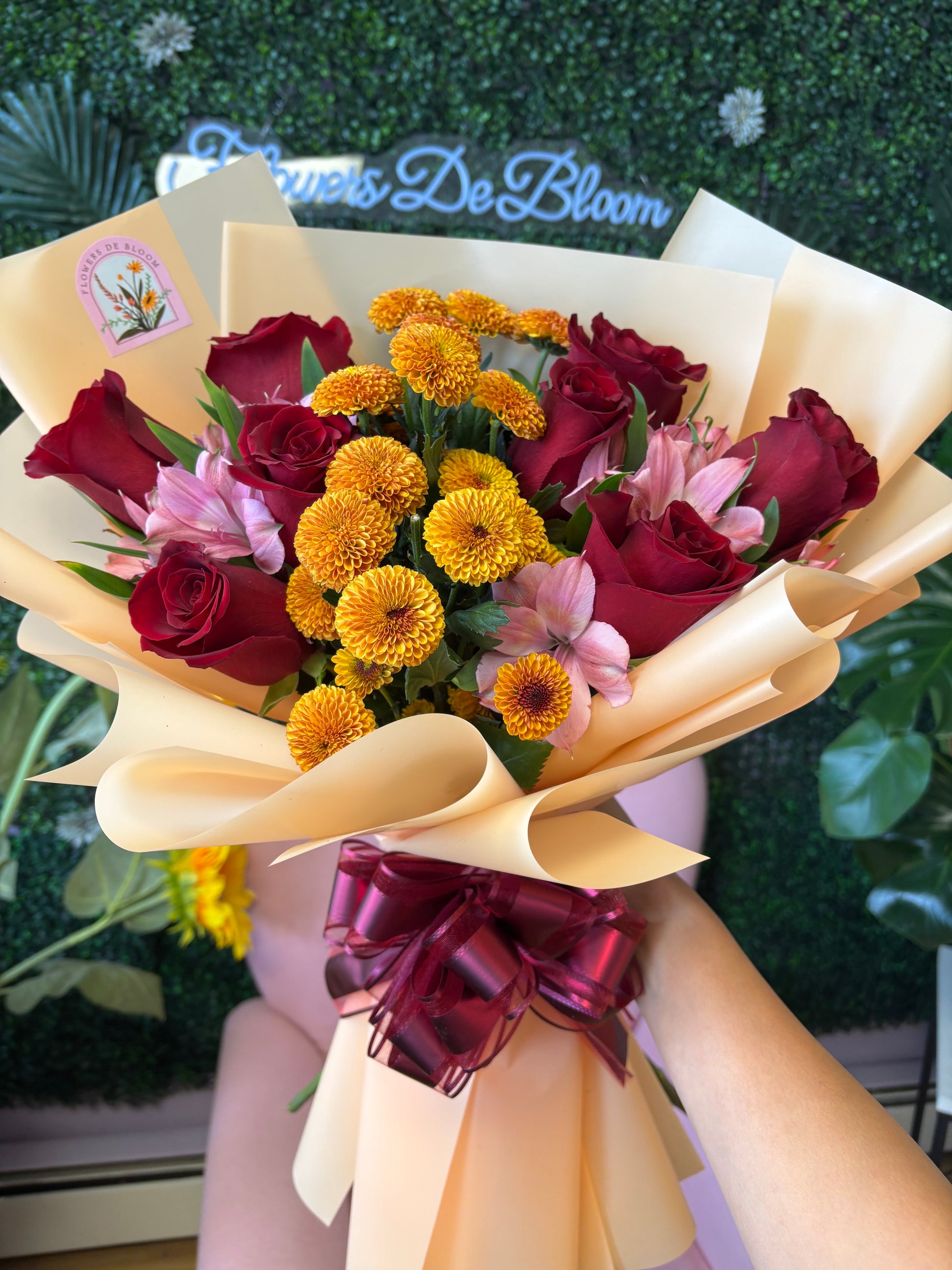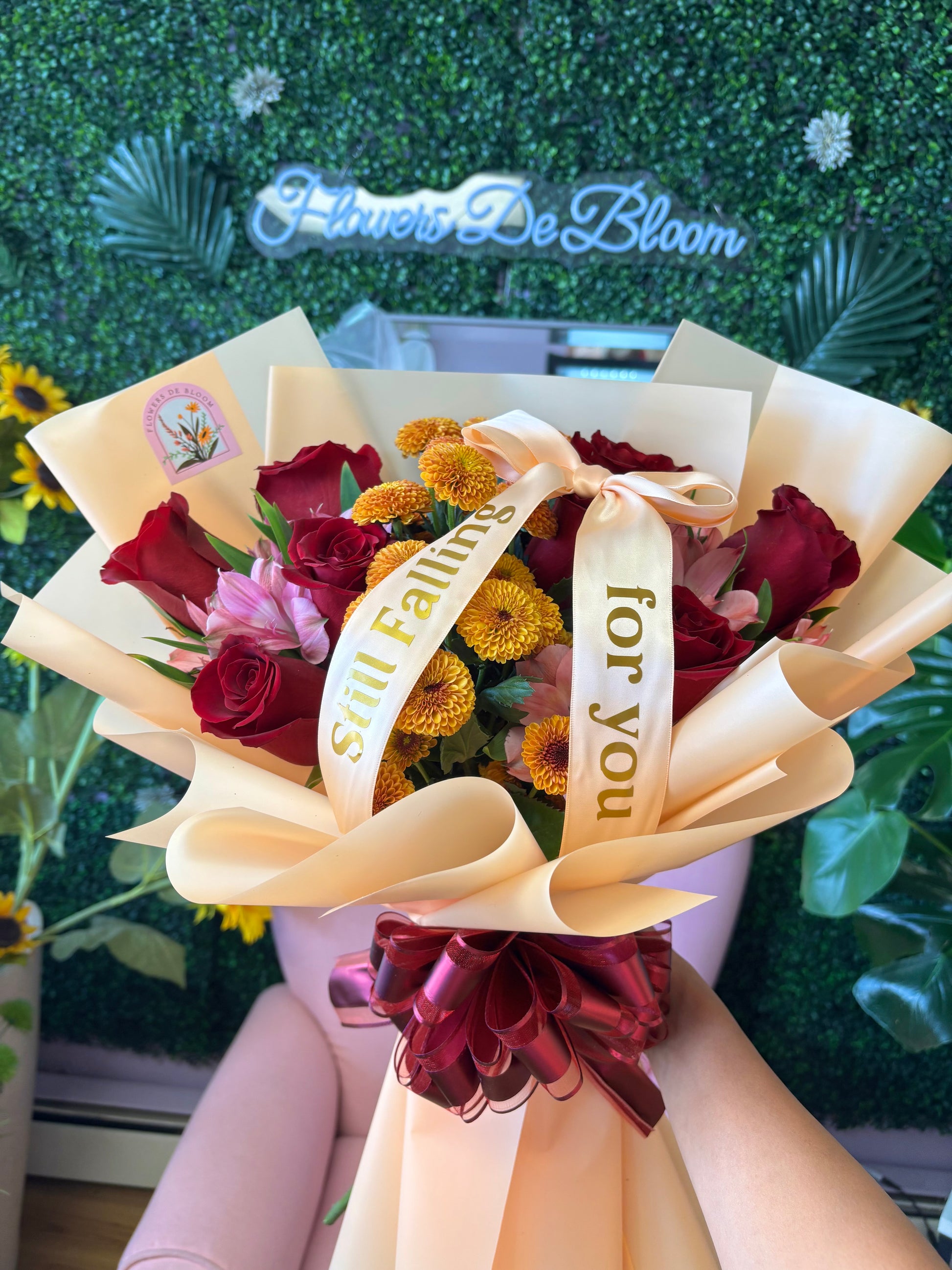 Tumble into autumn romance with our Still Falling For You bouquet! This charming arrangement captures the season's warmth with velvety roses, delicate alstroemerias, and cheerful button chrysanthemums in rich fall hues. Perfect for expressing your affection when the leaves are turning and hearts are warming up. A bouquet that says "I'm head over heels—especially for you!"